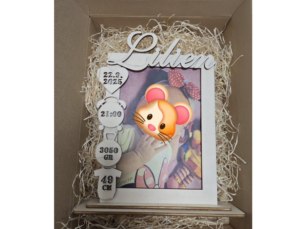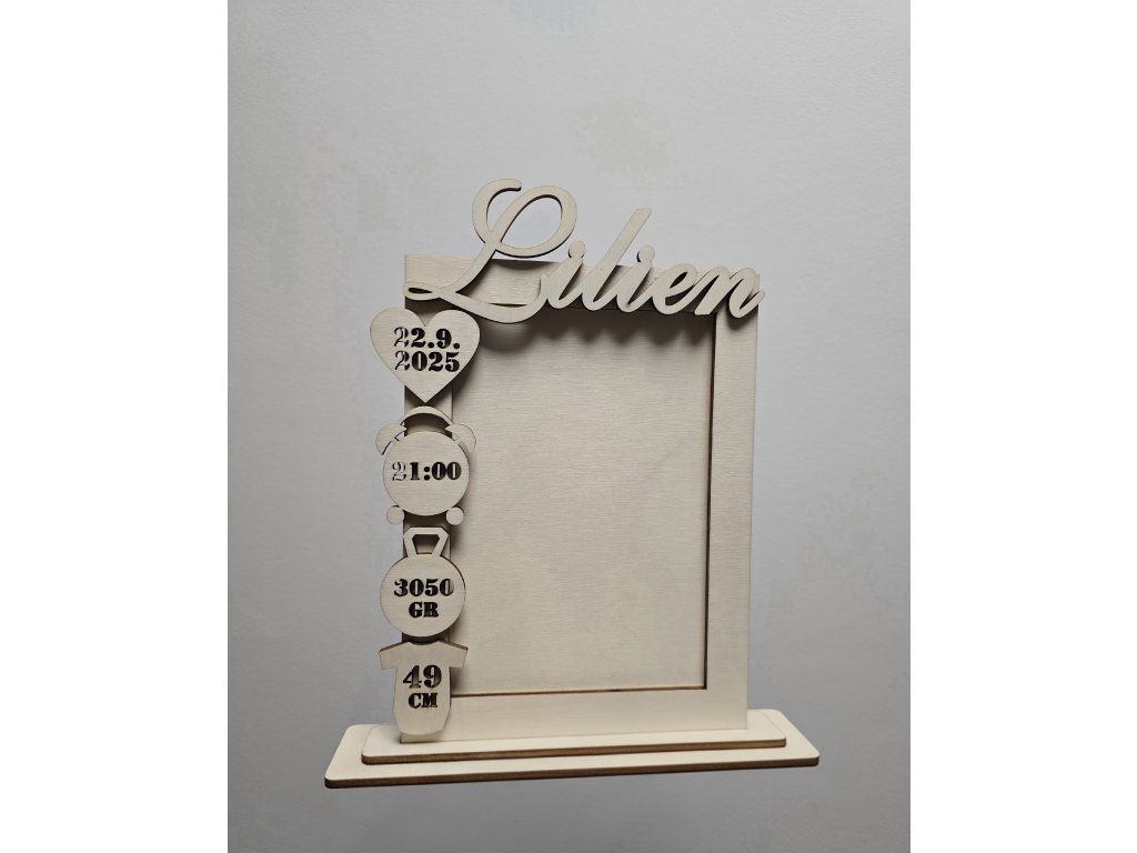 Drevený rámček s menom a údajmi