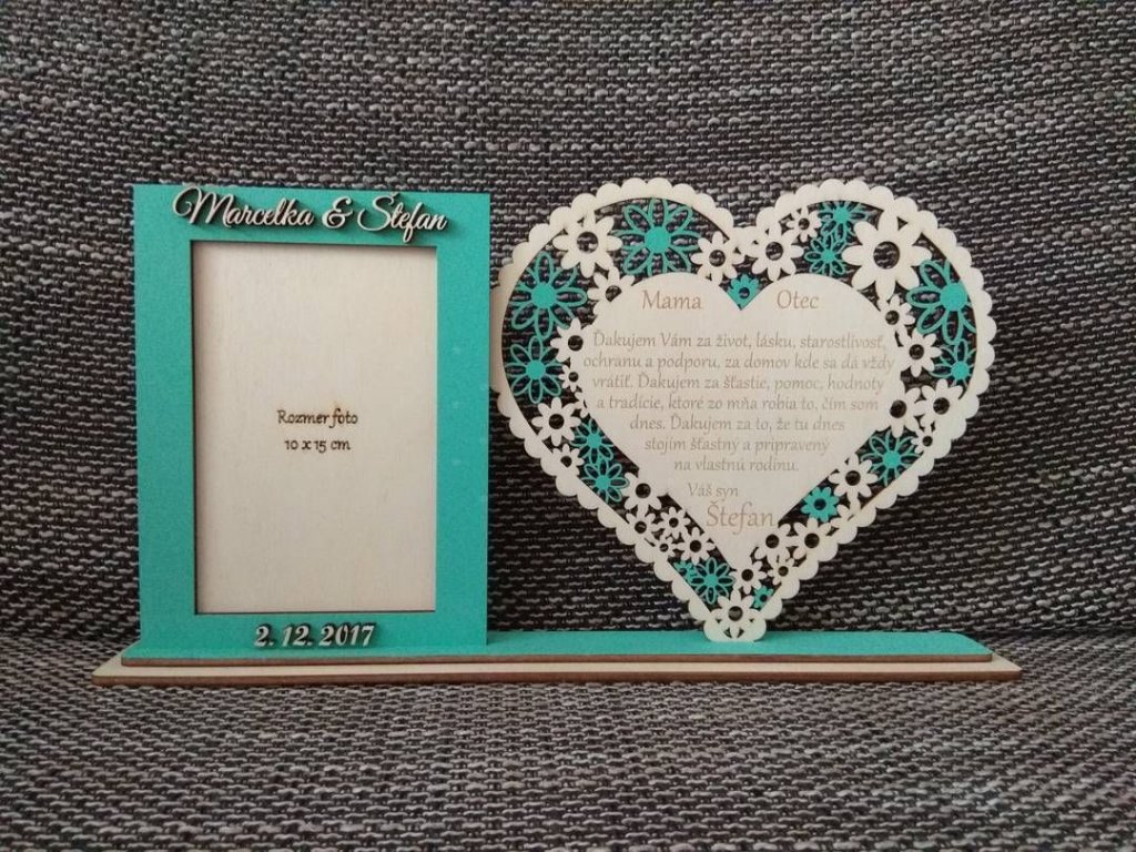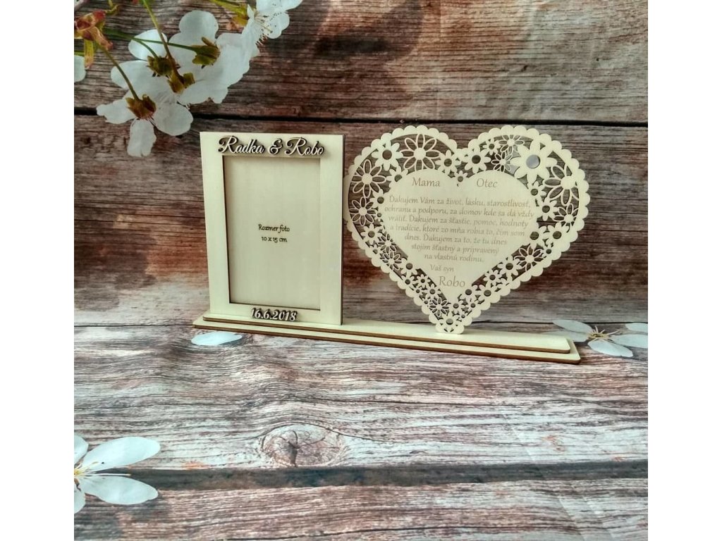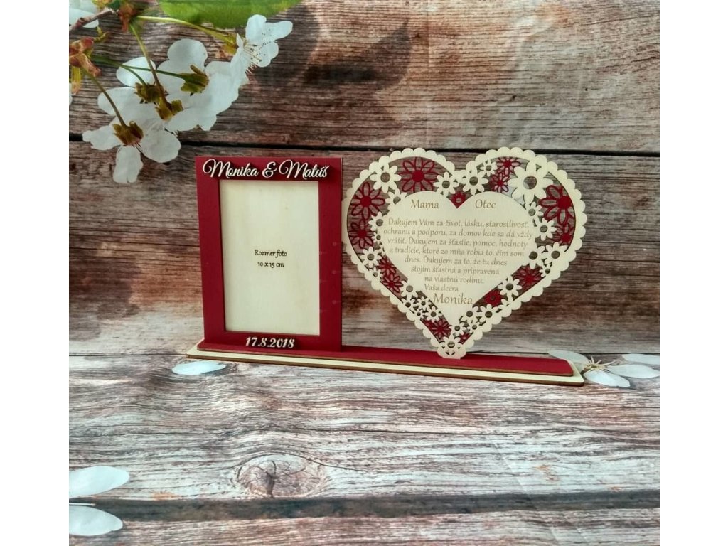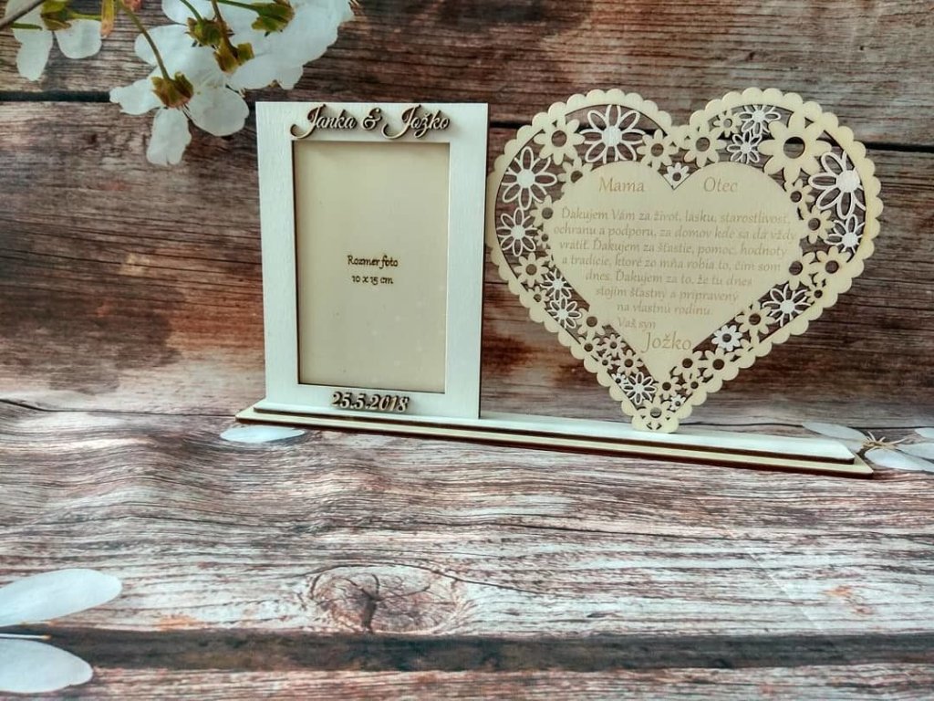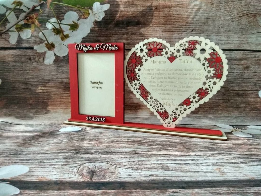 Skrášlite svoj Veľký deň a poďakujte za všetko rodičom takýmto vyrezávaným srdiečkom s fotkou Vás v rámčeku. Fotorámik je nelepený (vyberateľný) s možnosťou výmeny fotky. Srdiečko obsahuje: ďakovný text + meno na fotorámčeku sú mená a dátum Text upravíme podľa vašich požiadaviek, poprípade zmeníme úplne ;) (za zmenu textu účtujeme príplatok)Dodatočné parametre