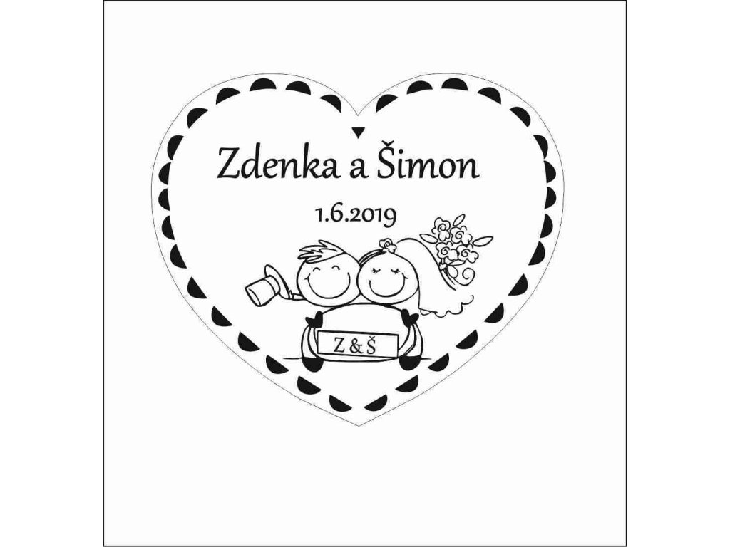 Srdiečko obsahuje mená, dátum, obrázok a poďakovanie.